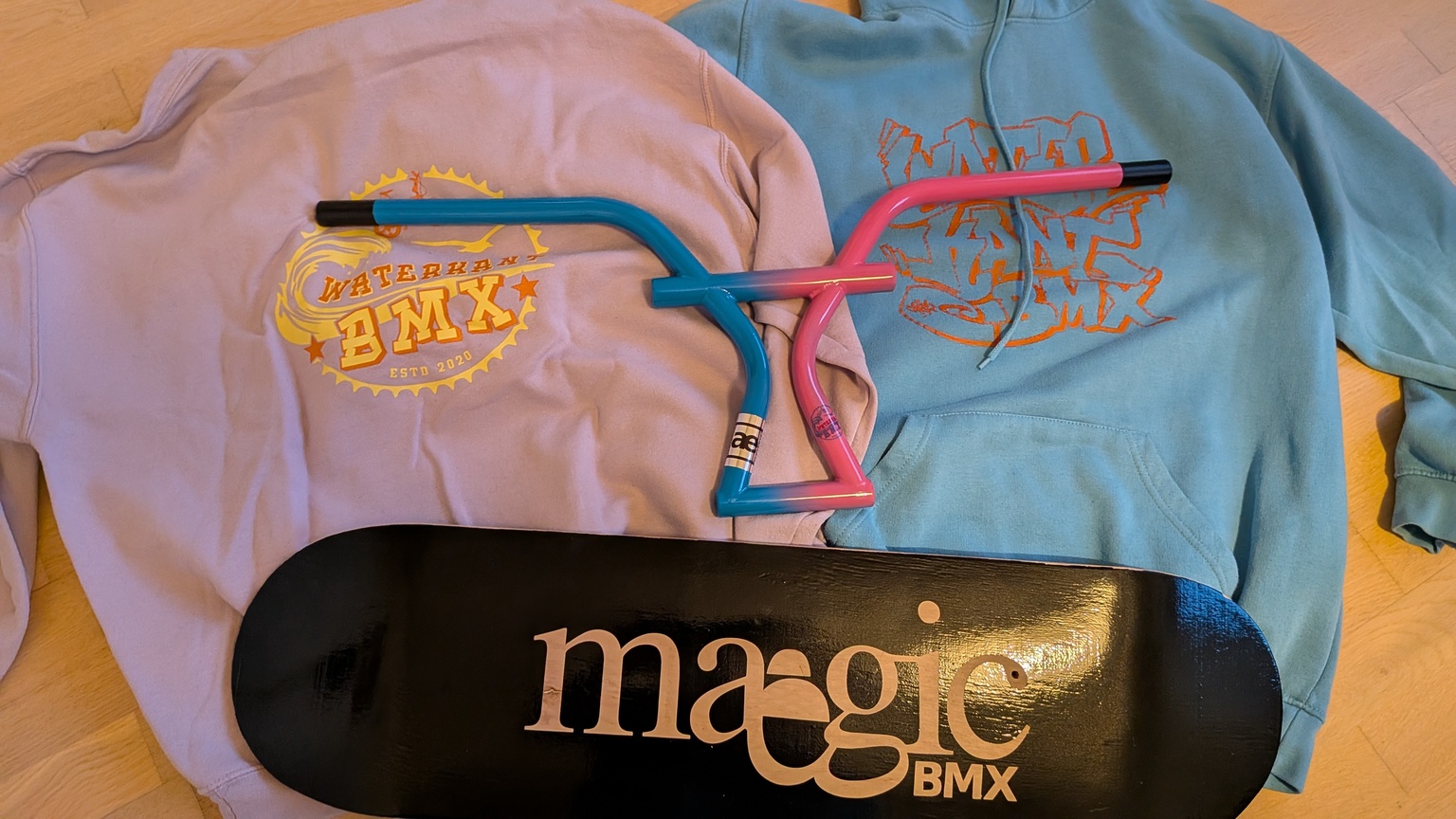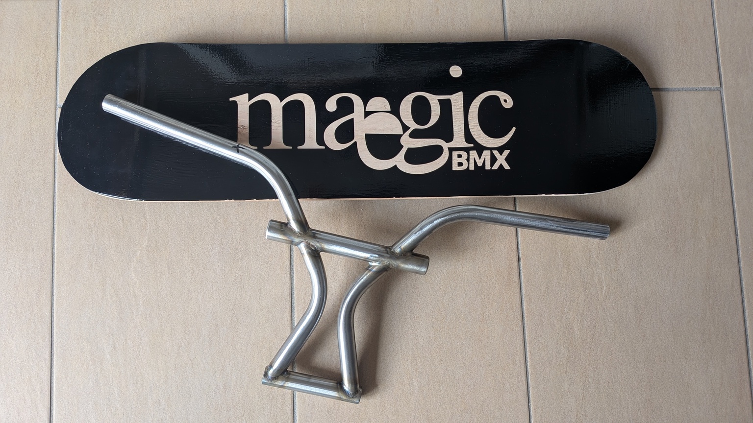 The maegic Malaga bars were created in collaboration between maegic BMX and waterkant bmx. This is a prototype made from 4130 chromoly steel; only one of the one ever made is a prototype. They are 28cm high and 65cm or 74cm wide, featuring a unique design and color. Suitable as a collector's item or for flatland riding. These handlebars will not be available for purchase, but will only be awarded as a prize at the Oldschool BMX Reunion Europe in Malaga, from April 17th to 19th, 2026, at Malaga Skatepark.